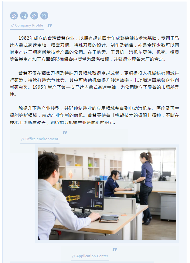 1982年成立的台湾普慧企业,以拥有超过四十年成熟稳健技术为基础,专司于马达内藏式高速主轴、精密刀柄、特殊刀具的设计、制作及销售,亦是全球少数可以同时生产这三项高质量技术产品的公司。